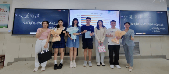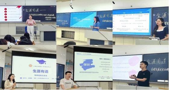在立信楼201阶梯教室举办了“生涯有道——全程生涯成长社群活动之考研交流会”主题活动。活动由年级辅导员金春丽老师主持,学院2022级拟考研的百余名学生及6位2020级考研、保研上岸优秀学生代表等参加了活动。