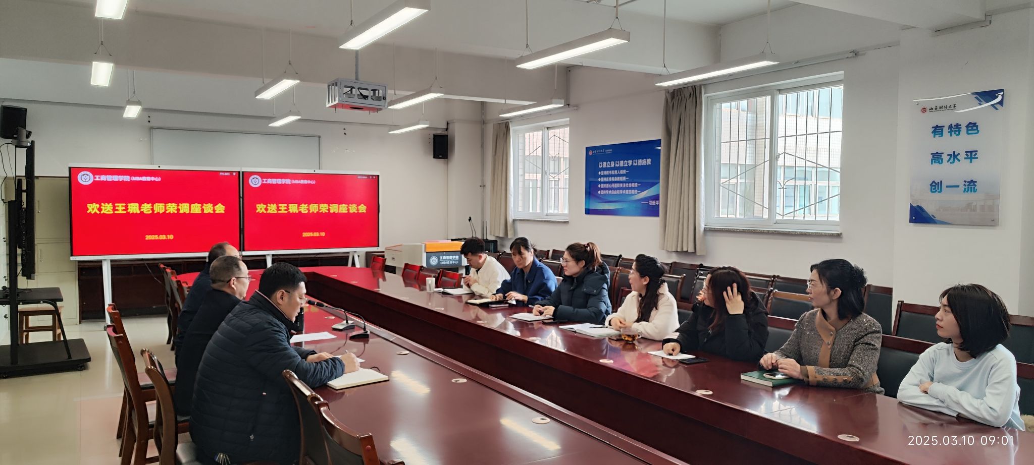 在会议室举行欢送王珮老师荣调座谈会。学院全体领导、办公室主任、全体辅导员参加了座谈会,会议由学院党委副书记周志刚主持。