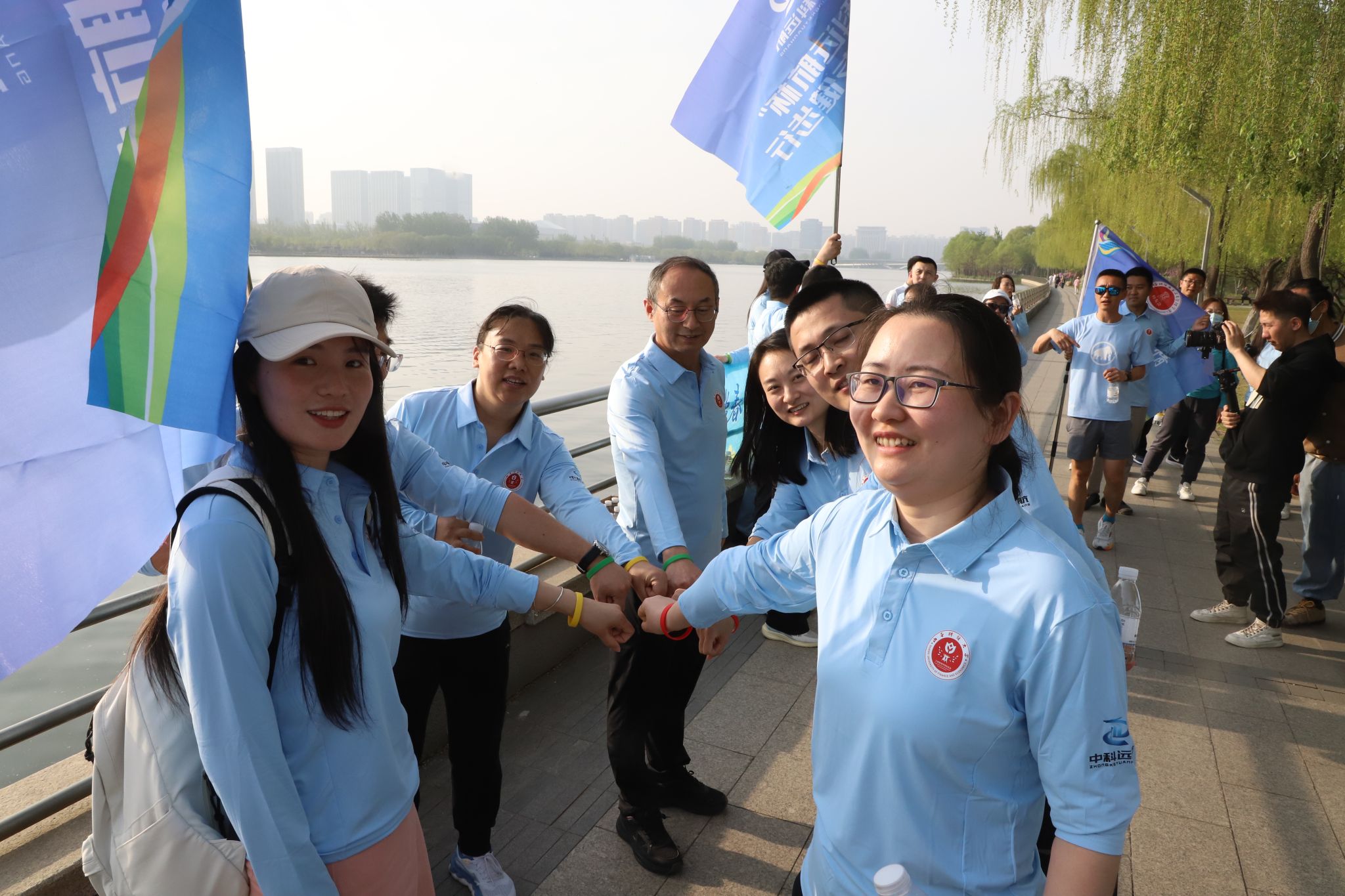 下午四点半,校友和老师们便早早地来到滨河公园跻汾桥东岸码头集合签到,统一着装。五点整,健步走活动正式开始。