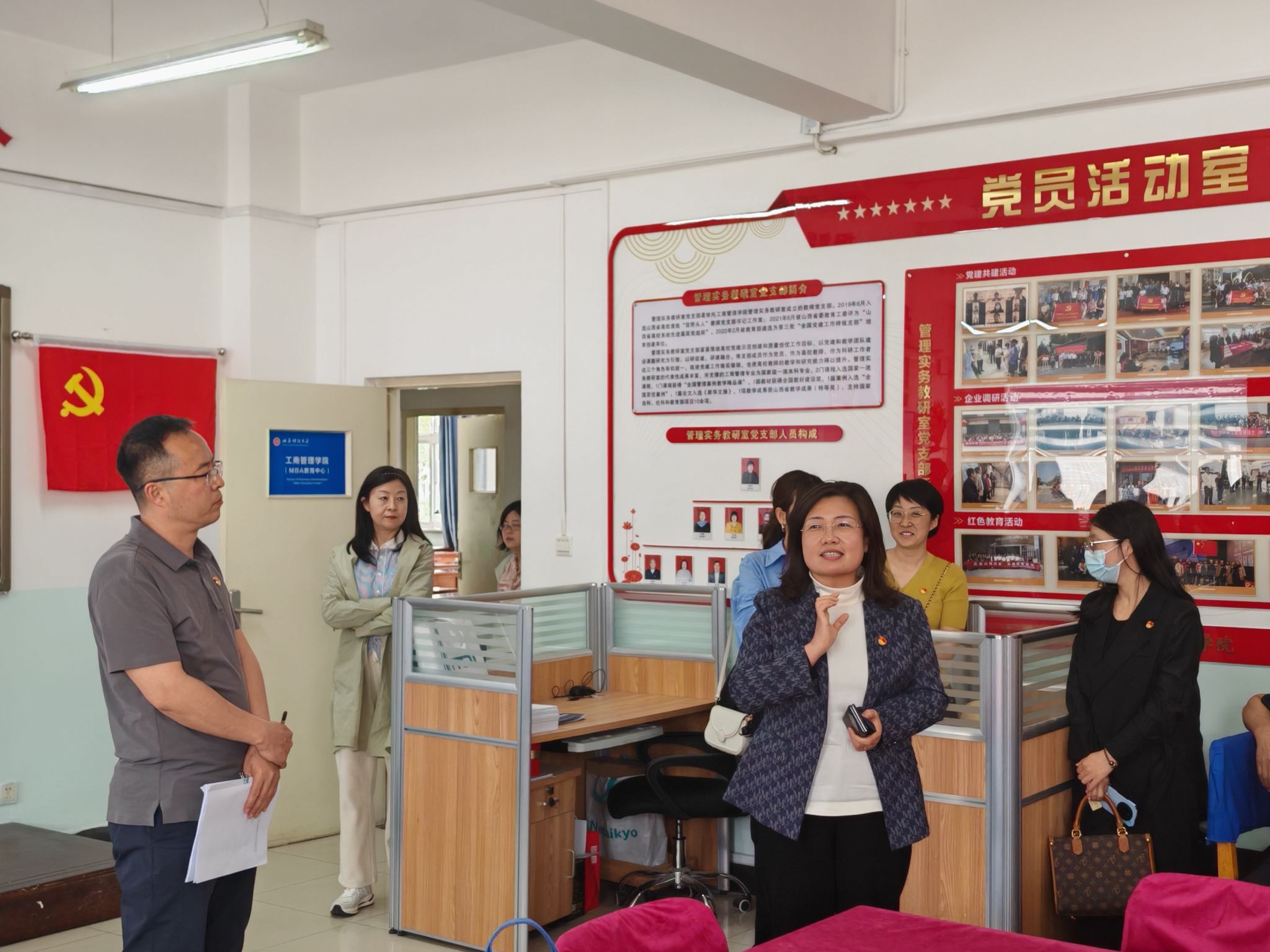 交流会上,学院副院长、管理实务教研室党支部代表薛继东以“党建引领强根基,创新驱动促发展”为主题,系统分享了样板支部建设的先进经验。她重点介绍了在样板支部建设、“双带头人”培育、党建与业务融合、品牌活动打造等方面的创新实践。全体党员实地参观了管理实务教研室党支部的党建文化墙、党员活动室及成果展区。参观过程中,党员们围绕“如何提升支部凝聚力”“如何破解党建业务‘两张皮’”等问题展开现场交流,管理实务教研室党支部委员逐一解答,为其他支部提供了可复制的经验。