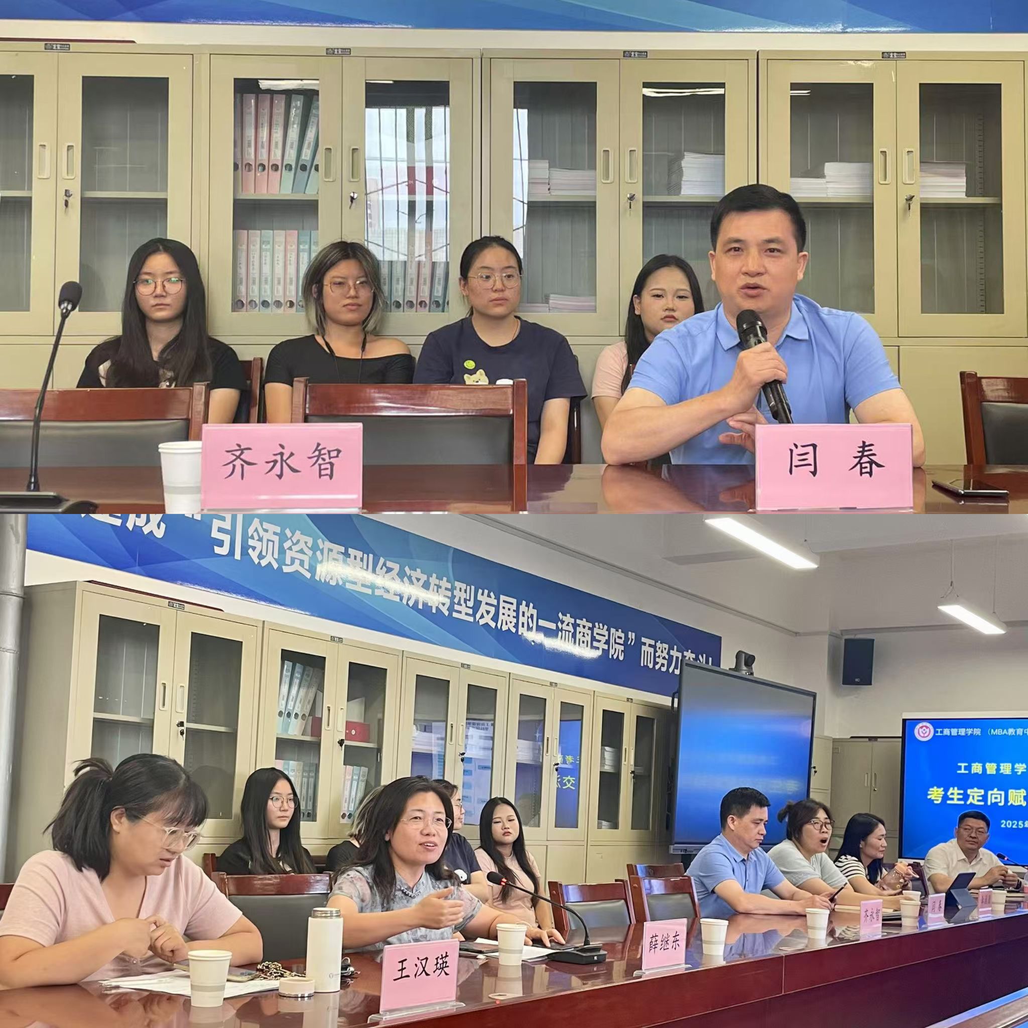 在会议室召开考研考生定向赋能辅导交流会。学院副院长薛继东、齐永智,科研部副部长闫春,管理原理教研室王汉瑛教授,营销教研室副主任李园园副教授,人力资源管理教研室副主任陈虹博士,物流管理教研室郭金花副教授,2022级学生辅导员金春丽老师以及2022级在校本科生参加了交流会。