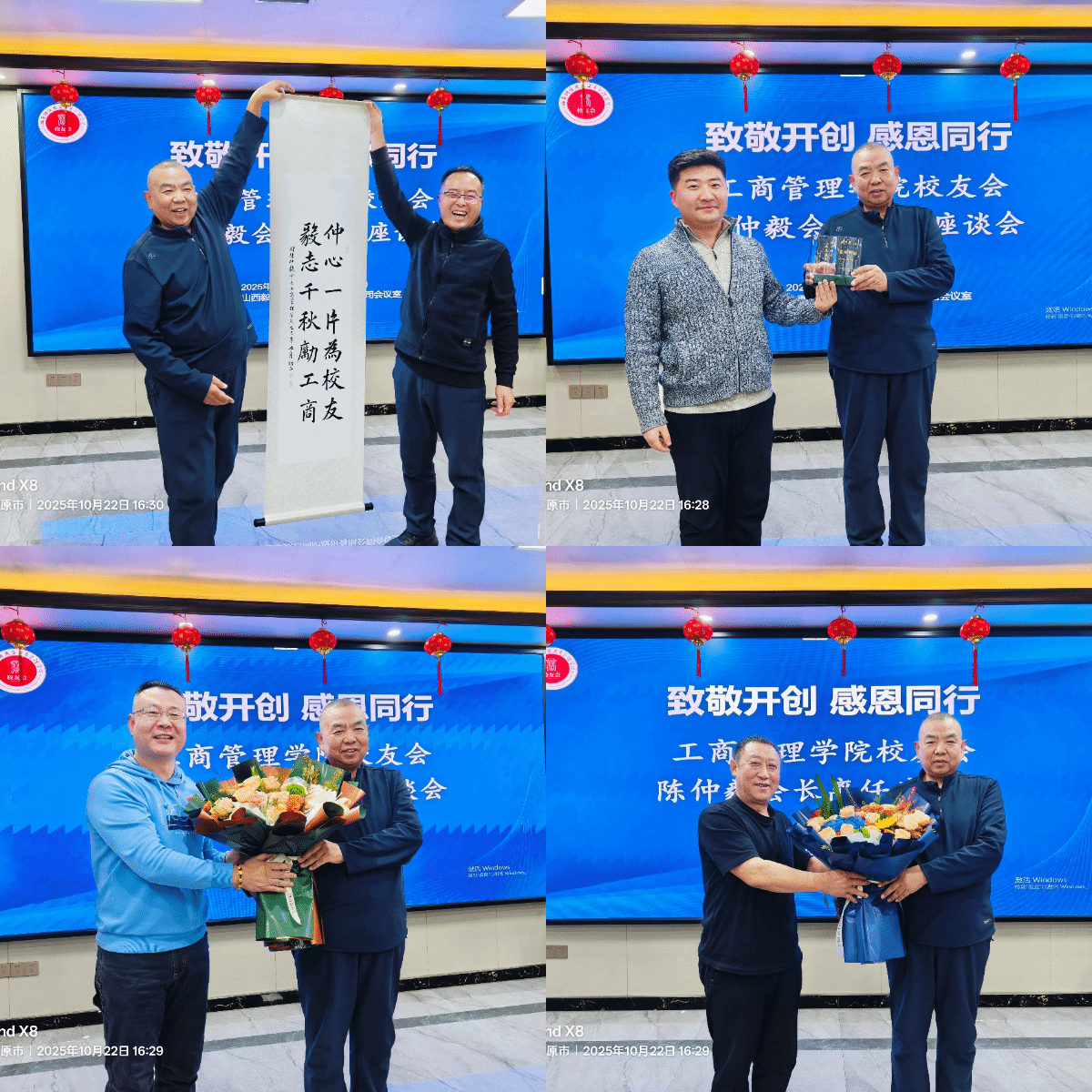 在温馨的氛围中,陈仲毅会长接受了各方代表的深情厚谊。党委书记李群生代表学院送上字画,副会长徐强与副秘书长苗玉瑞代表校友会分别送上礼品与鲜花,李全中代表忻州校友会献花致意。