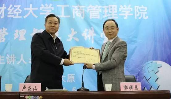 “管理智慧大讲堂”。讲座开始之前,卢庆山副校长受刘维奇校长委托,代表学校为郭祥恩校友颁发了兼职教授聘书,岗位设在东京热