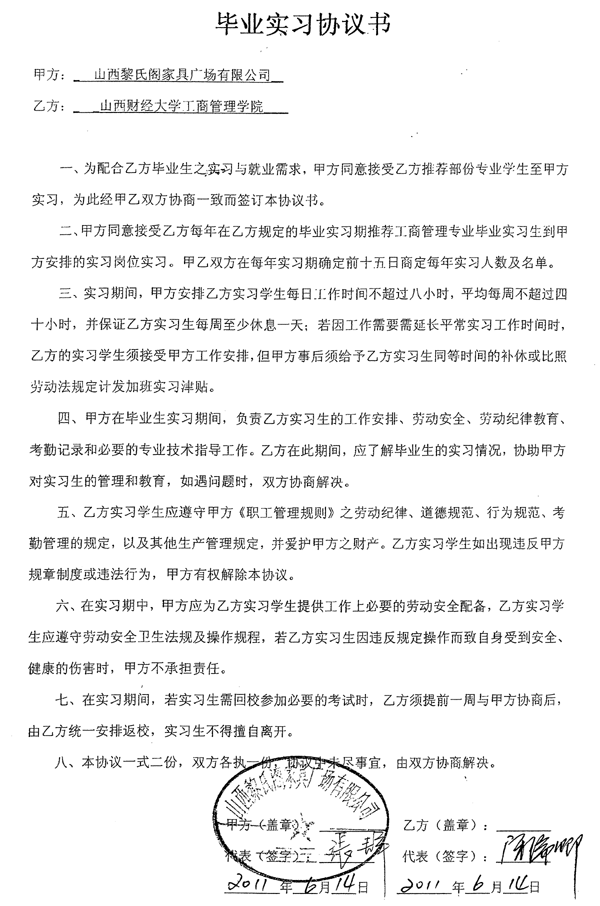毕业实习协议--山西黎氏阁家具广场