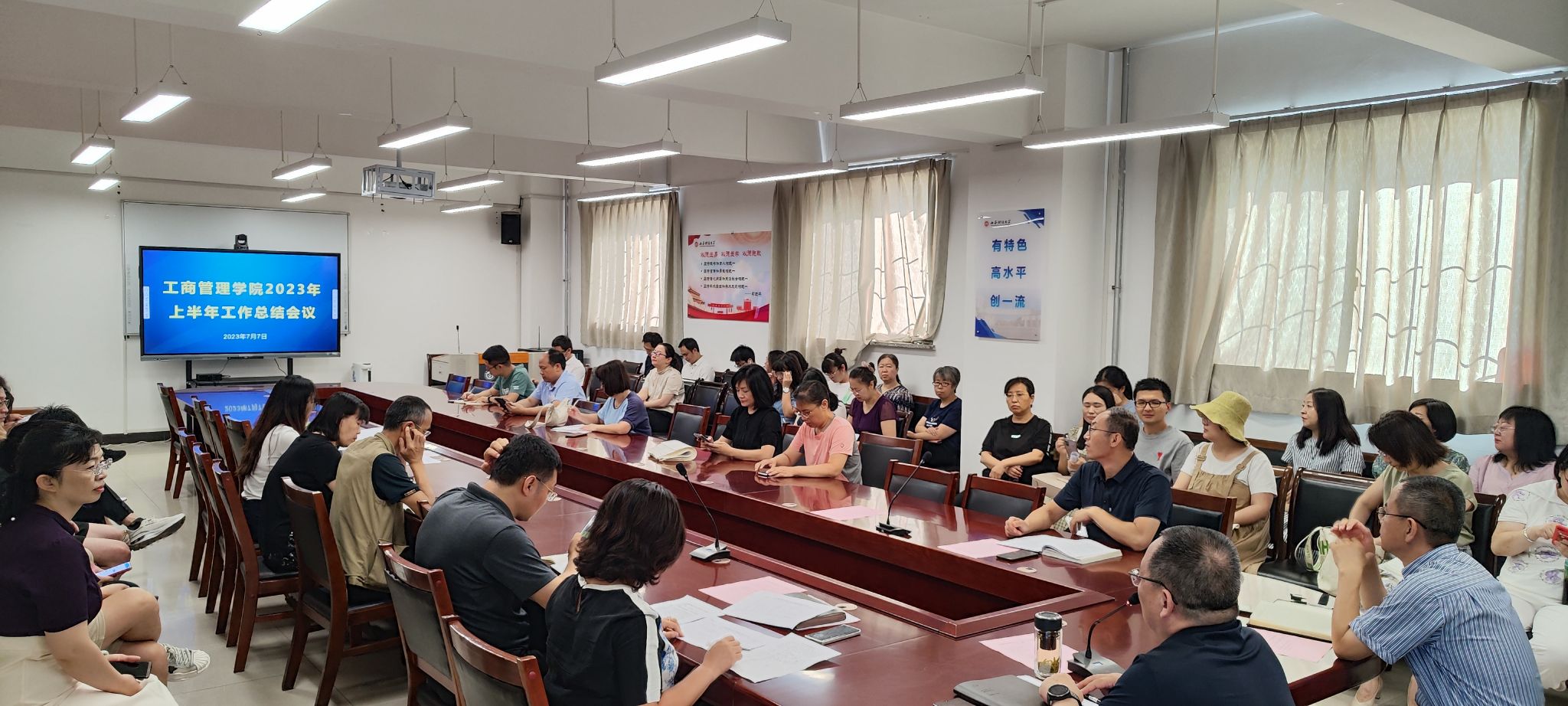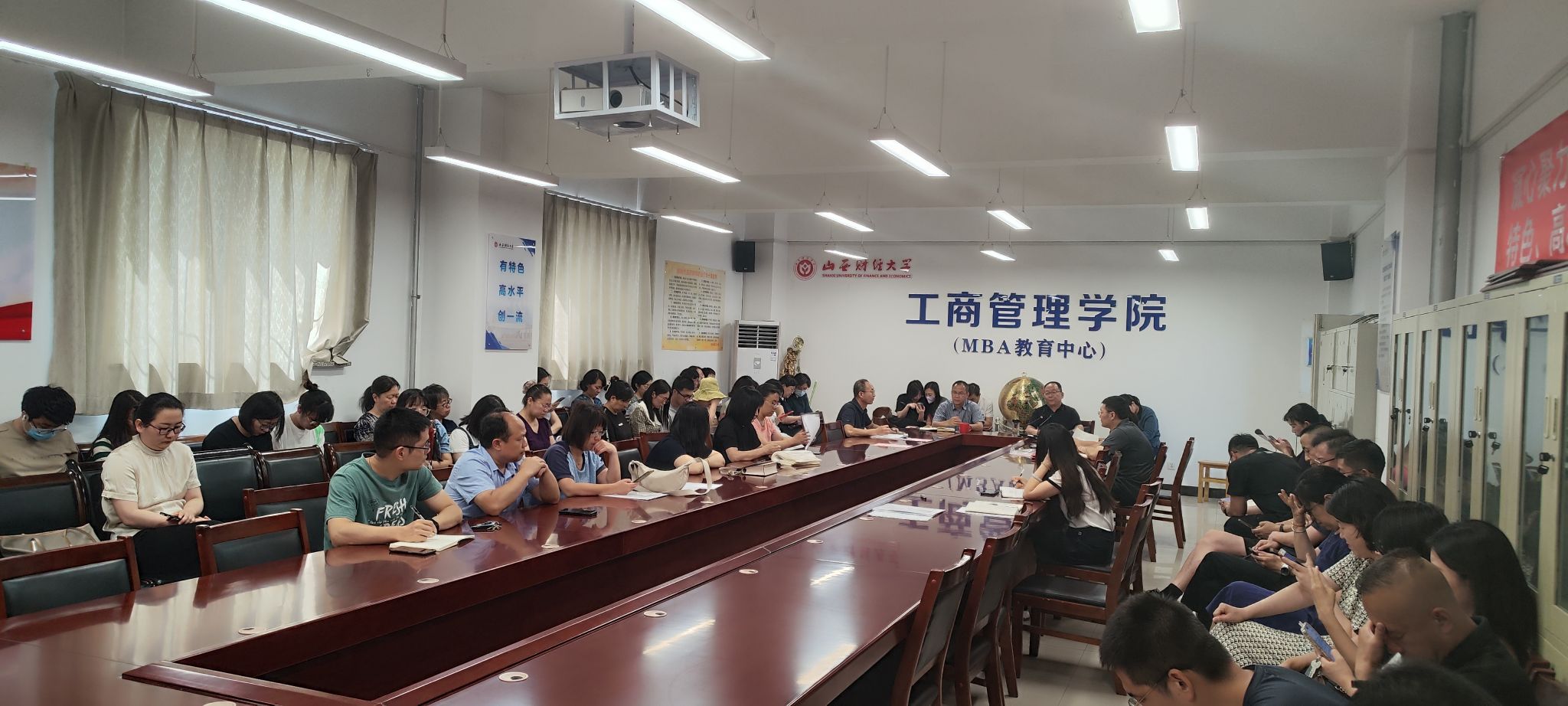 听取汇报后,卫虎林院长对上半年学院在教育教学各方面所取得成绩予以充分肯定,并就暑假期间及下学期学院重点工作从五个方面做了安排。一是以学科建设为龙头推进学院各项工作,要求近年来新入职博士要尽快纳入相关学科团队,加强有组织的科研工作,积极推进商科国际认证,做强做优MBA品牌;二是以审核评估为抓手,提升专业建设和课程建设水平,要利用暑假期间做好审核评估涉及到的相关工作;三是强化师资队伍建设,确保正教授数量稳定在一定水平,加强对近年来新入职博士教学能力的培养,不断提升课堂教学水平;四是以各教研室为单位,主动出击,开展各类社会服务;五是强化各项管理的规范化、程序化、制度化,不断提升学院治理体系与治理能力建设。谋划筹备学院校友会建设工作,加强建设和培育迎新与入学典礼、毕业典礼、运动会、职工荣退仪式、学院文化墙等品牌建设,以每年一度的新年联欢会为基础,传承与弘扬工商学院优秀文化。