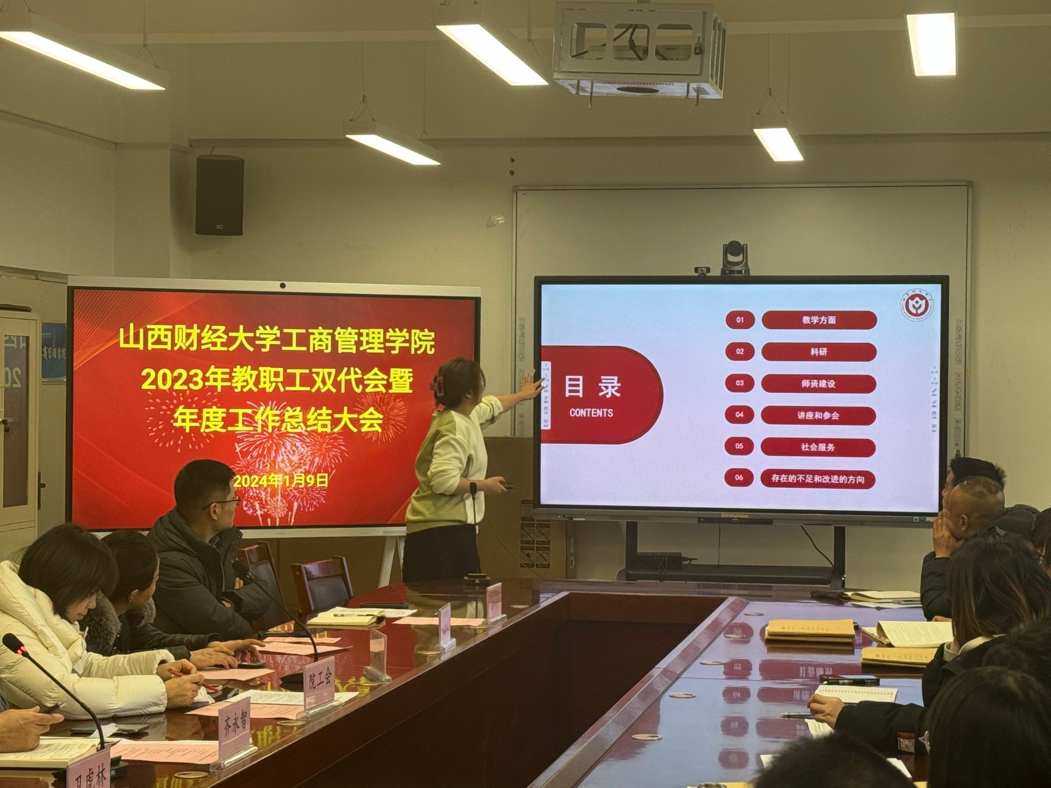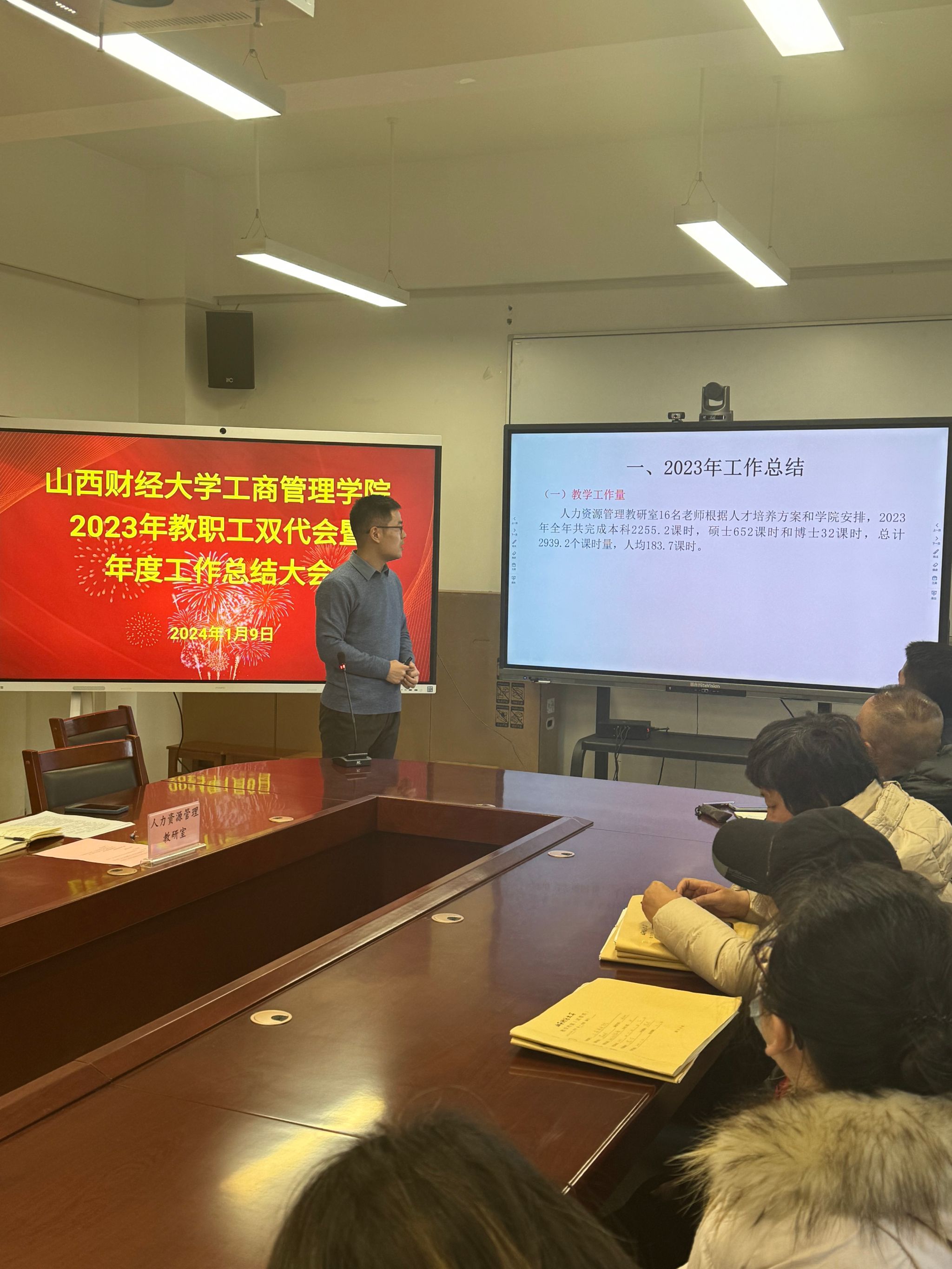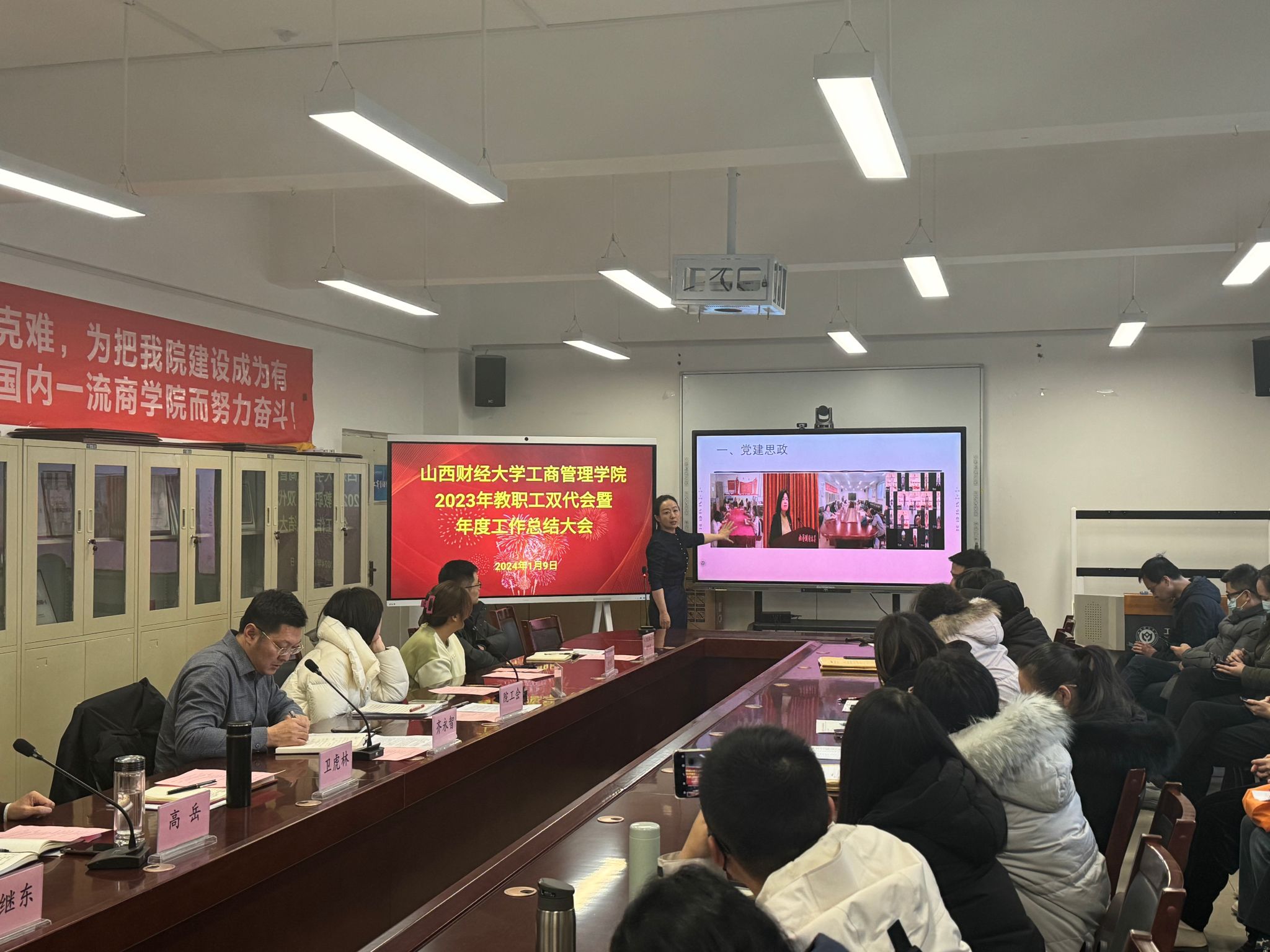 在会议室举行了2023年教职工双代会暨年度工作总结大会。学院领导、全体教职工参加会议。会议由学院党委书记高岳主持。