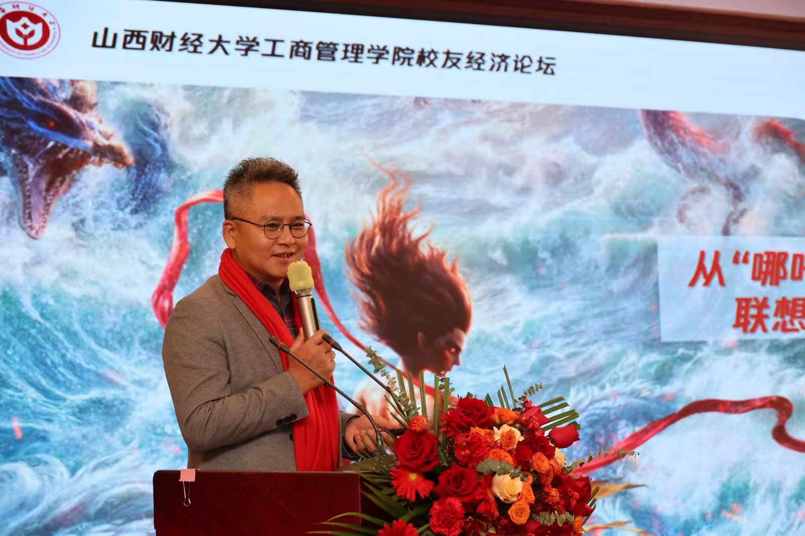 校友会副会长、山西智胜传媒科技股份有限公司董事长郭海明则以《哪咤闹海,校友弄潮——从哪吒联想到校友经济》为题,巧妙地结合电影中的经典桥段,生动形象的总结了关于校友经济的三点启示:人心中的成见是座山,但校友经济能移山;若命运不公,便和他斗到底。校友合力,方可化身“三头六臂”;我命由我不由天,校友当立封神榜。2007级物流管理校友、东京热