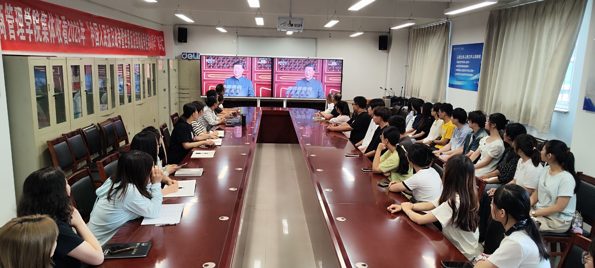 党委组织学院全体师生以多种形式收听收看了“纪念中国人民抗日战争暨世界反法西斯战争胜利80周年大会”现场直播。学院全体领导、行政管理人员、院工会主席、辅导员以及部分学生代表等40余人,在学院会议室集中收看了现场直播,共同见证这一激动人心的历史时刻。大家纷纷表示,以身为中国人感到骄傲与自豪,要努力在实现中华民族伟大复兴的征程中贡献自己的一份力量。