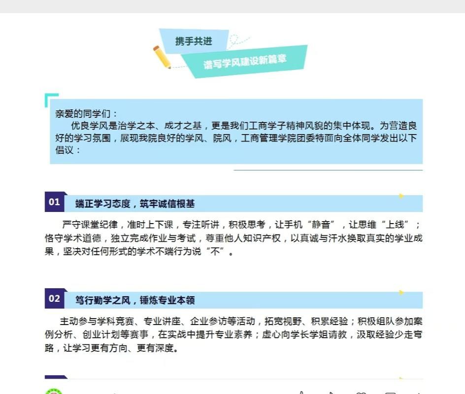 筑牢根基:高度重视,精心擘画学风蓝图。学风建设是落实立德树人根本任务的基础性工作,是提高人才培养质量的关键所在。学院高度重视,成立了以书记、院长为组长,其他院领导为副组长,教研室主任、辅导员为成员的学风建设月工作组,研究制定了工作方案,并在学院微信公众号上向全院师生发出《携手共进,谱写学风建设新篇章》的倡议书。