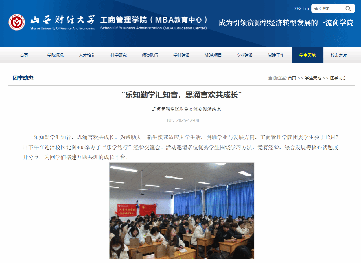 学生互助:携手共进,促进全面成长成才。学院团委学生会于12月2日举办了“乐学笃行”经验交流会。邀请多位优秀学生分享学习方法、竞赛经验等,为同学们搭建了互助共进的成长平台。此外,学院还通过日常行为管理“369”活动方案,引导学生养成良好的学习习惯和健康的生活方式。