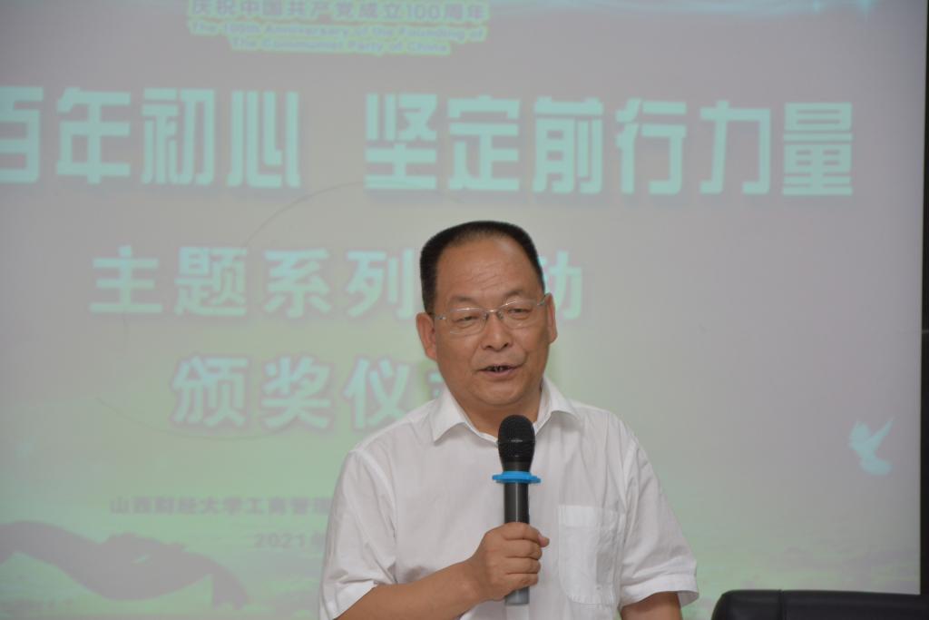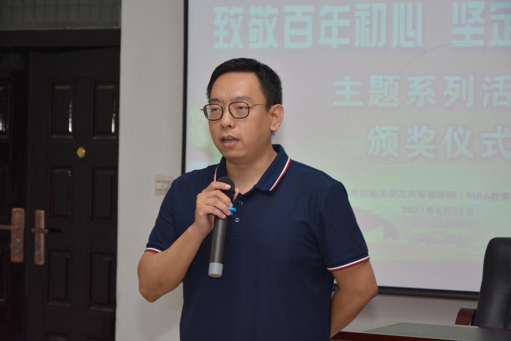 第十五届MBA联合会宣传网络部主办的“致敬百年初心 坚定前行力量”主题系列活动颁奖仪式在MBA二教室隆重举办。学院院长、MBA教育中心主任卫虎林,MBA教育中心办公室副主任张芳,2020级MBA班主任王治以及赞助商代表中国工商银行太原白家庄行行长董森应邀出席颁奖仪式。第十五届联合会主席团、各部门代表、MBA各班代表及全体获奖选手参加颁奖仪式。第十五届MBA联合会宣传部部长张勃主持颁奖仪式。