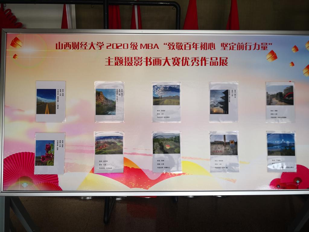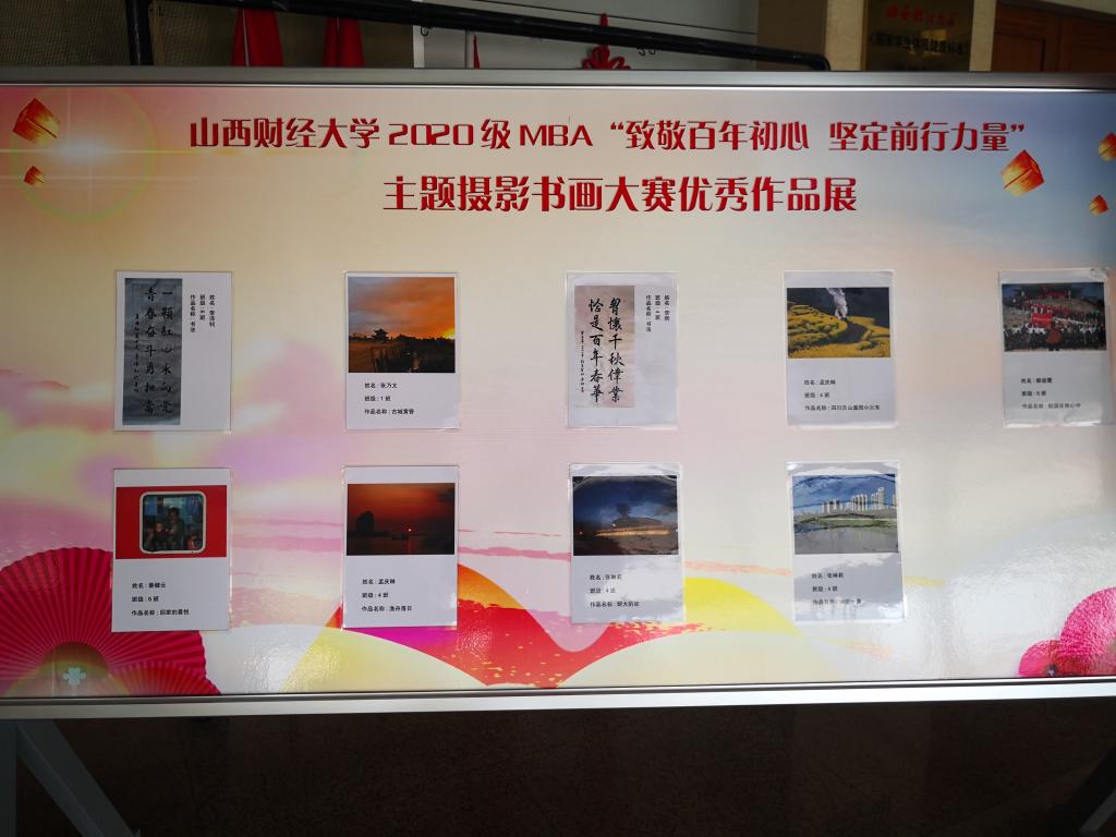 2020级MBA全体学员把对党的恩情、对社会主义的信仰、对人民的热爱融入工作、生活、学习当中,积极参与本次书画摄影展以及红歌展演等活动,用画面定格精彩、用毛笔书写热爱、用歌声赞颂党恩。经过两个月的紧张筹备、公示、投票等阶段,评选出摄影作品一等奖1名、二等奖2名、三等奖3名、优胜奖7名,书法作品一等奖1名,二等奖1名。