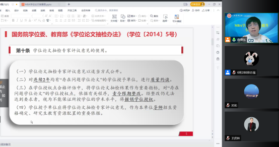MBA学位论文培养情况、全国MBA教指委《MBA学位论文标准与规范》、“不合格”学位论文的评审意见、MBA学位论文开题报告要点五个部分进行了讲解和分析。通过聆听此次报告,老师和学生们对MBA学位论文的标准、流程、要求、常见问题及解决方案等方面有了更加深入地了解。而后,MBA学员代表吴拓进行了学位论文写作心得体会分享,与会人员进行了问题交流。