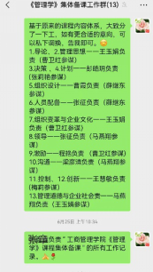 6月23日,创建了“《管理学》课程集体备课工作群”。其中,8位在课程建设中深度参与、熟悉内容体系、非常有责任心且新学期有教学任务的老师作为主讲教师,承担后续集体备课研讨会上的说课任务;6位在近几年《管理学》教学任务虽少,但教学管理及教学实践经验丰富、在课程建设中亲历《管理学》成为省级精品课程、学校首批慕课、首批省级线上精品共享课程、首批国家级线上线下混合式一流课程、省级首批课程思政示范课程等各个重要建设阶段、非常有热心的教师,主要负责建言把关。通过组织学习领会文件精神,大家明确了集体备课的重要意义、具体要求、主要内容及实施方式等,特别强调了马工程教材的使用与课程思政的设计,制定了具体工作计划时间表和任务图,统筹安排,责任到人,分工协作。