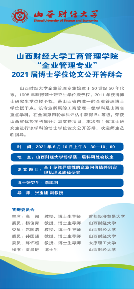 6月10日上午8:30—10:30东京热 将举行2021届企业管理专业博士学位论文公开答辩会,地点在博学楼二层科研处会议室,本次共有1位博士生李鹏利进行答辩,首都经济贸易大学高闯教授担任答辩委员会主席,其他答辩委员有东京热 杨俊青教授、东京热 赵国浩教授、东京热 孙国强教授、太原理工大学陈怀超教授。具体答辩信息见下面海报,欢迎师生莅临指导。