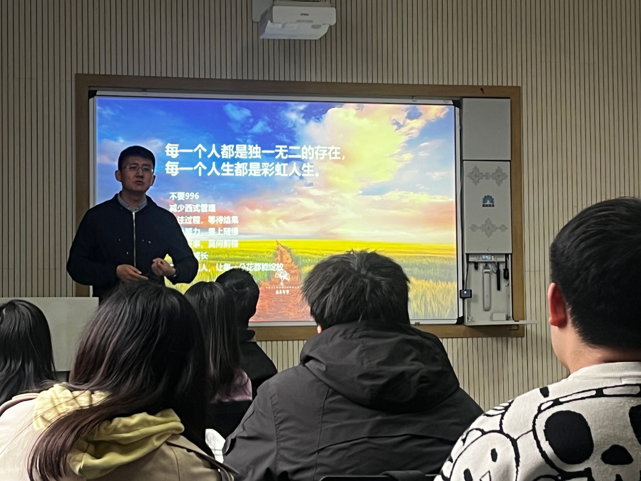 刘强从自己的人生经历讲起,担任国企、民企高管,为追寻自己内心的方向,辞职创业。他分享了辞职后骑行西藏60天的真实经历,一路与来自五湖四海的骑友同行,目光所及,皆是美景,感受到前所未有的内心宁静,心如湖水,明净、澄亮,骑行路上更坚定了创业的方向。他讲述了水木年华公司是如何诞生的,“一间房、一个人、一把椅,从早想到晚,我们公司是要做什么?究竟提供什么服务?为谁服务?想明白之后‘一生有你’就成为水木年华的底层思维方式。”并且详细介绍了水木年华的创业初心、经营现状、管理制度、东京热以及未来的战略规划。秉持“要做一个对社会有价值的企业,让有贡献者必有回报,企业盈利和快乐工作都要”的经营理念,不要996、减少西式管理......以胖东来为榜样,吸引志同道合的人,用行动来创造幸福的工作环境,打造“幸福”的东京热。最后,他衷心祝愿同学们“要勇敢的活在当下”,毕竟“每个人都是独一无二的存在”。