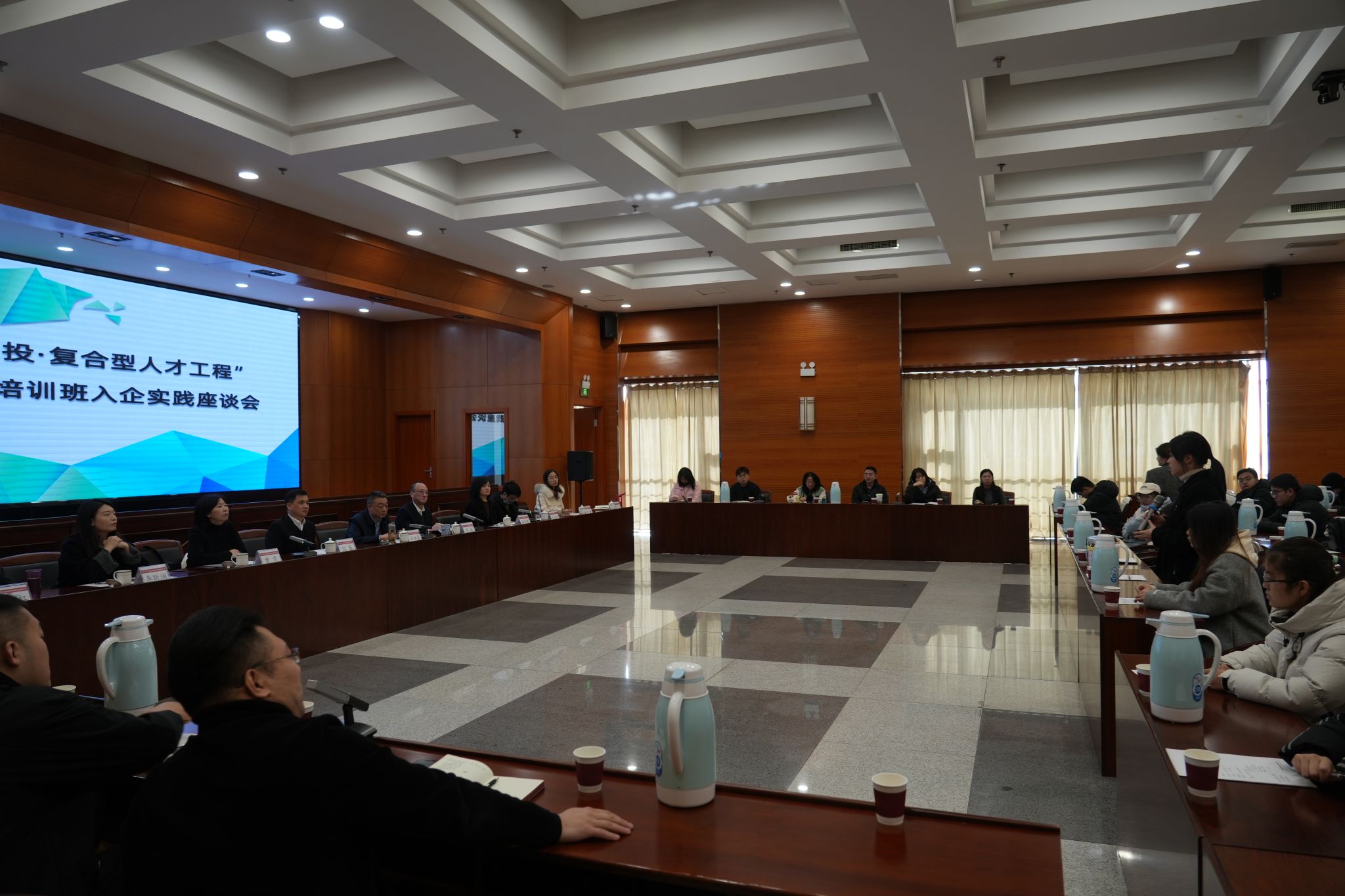 科研部副部长闫春、管理原理教研室负责人张莉艳的带领下,商业领导力微专业师生一行43人赴山西省经济建设投资集团有限公司(以下简称“经建投”)开展入企实践活动。本次入企实践得到了经建投的热情欢迎和大力支持,经建投党委委员、副总经理李洪晋主持座谈会,经建投副总经理苏斌出席并发表讲话,经建投组织人事部部长张晓红及选修微专业课程的10名经建投学员全程陪同。