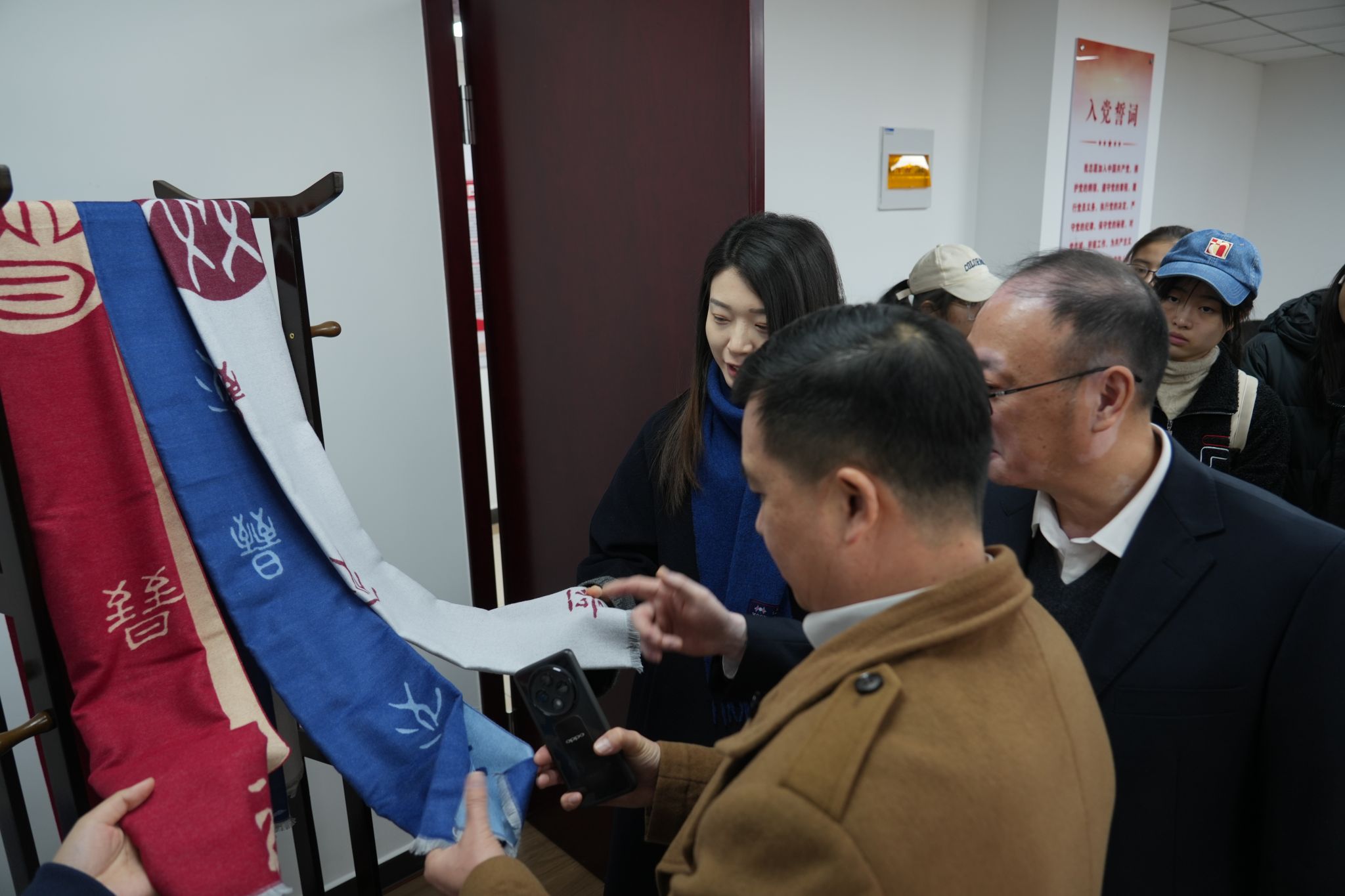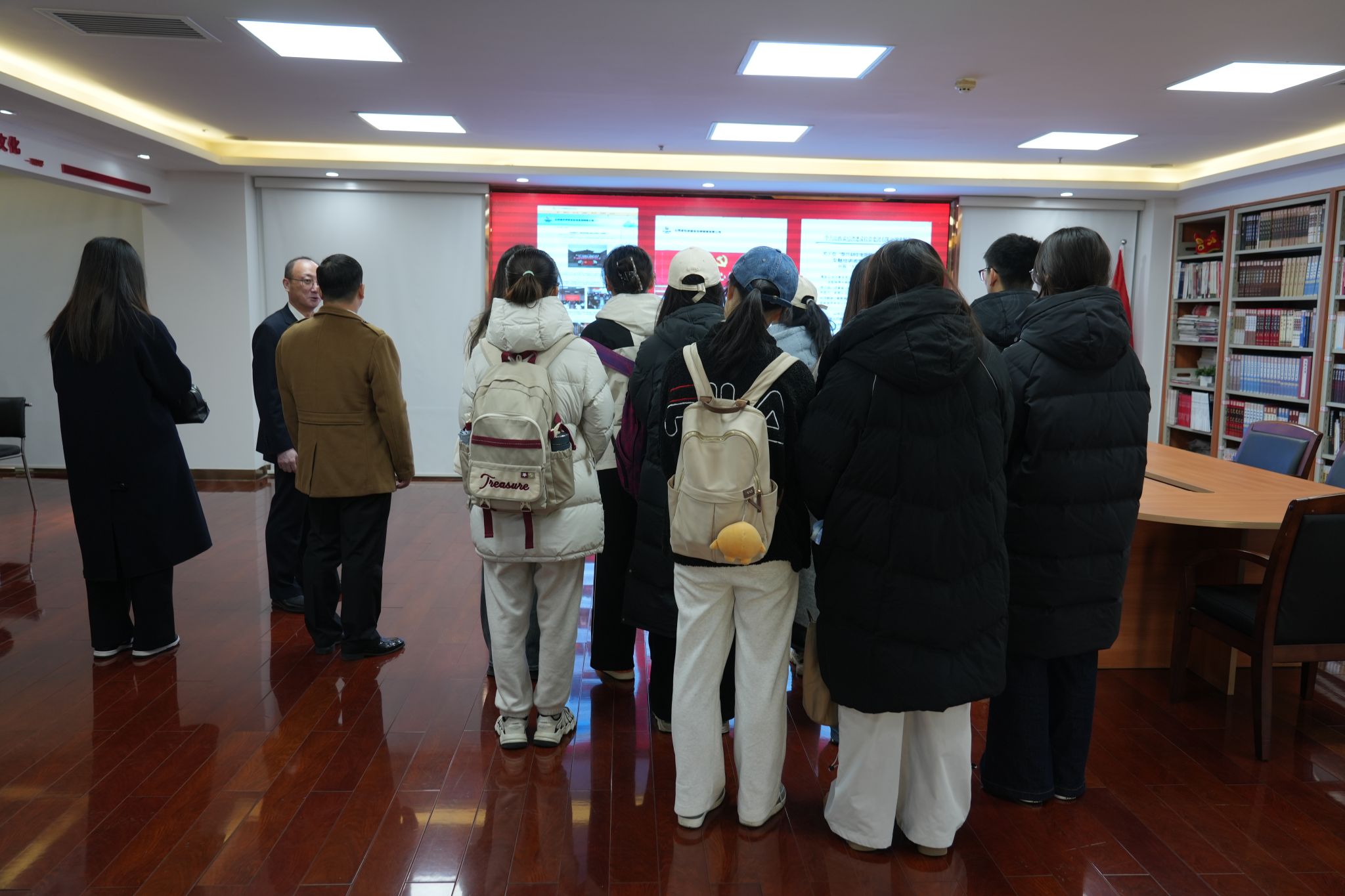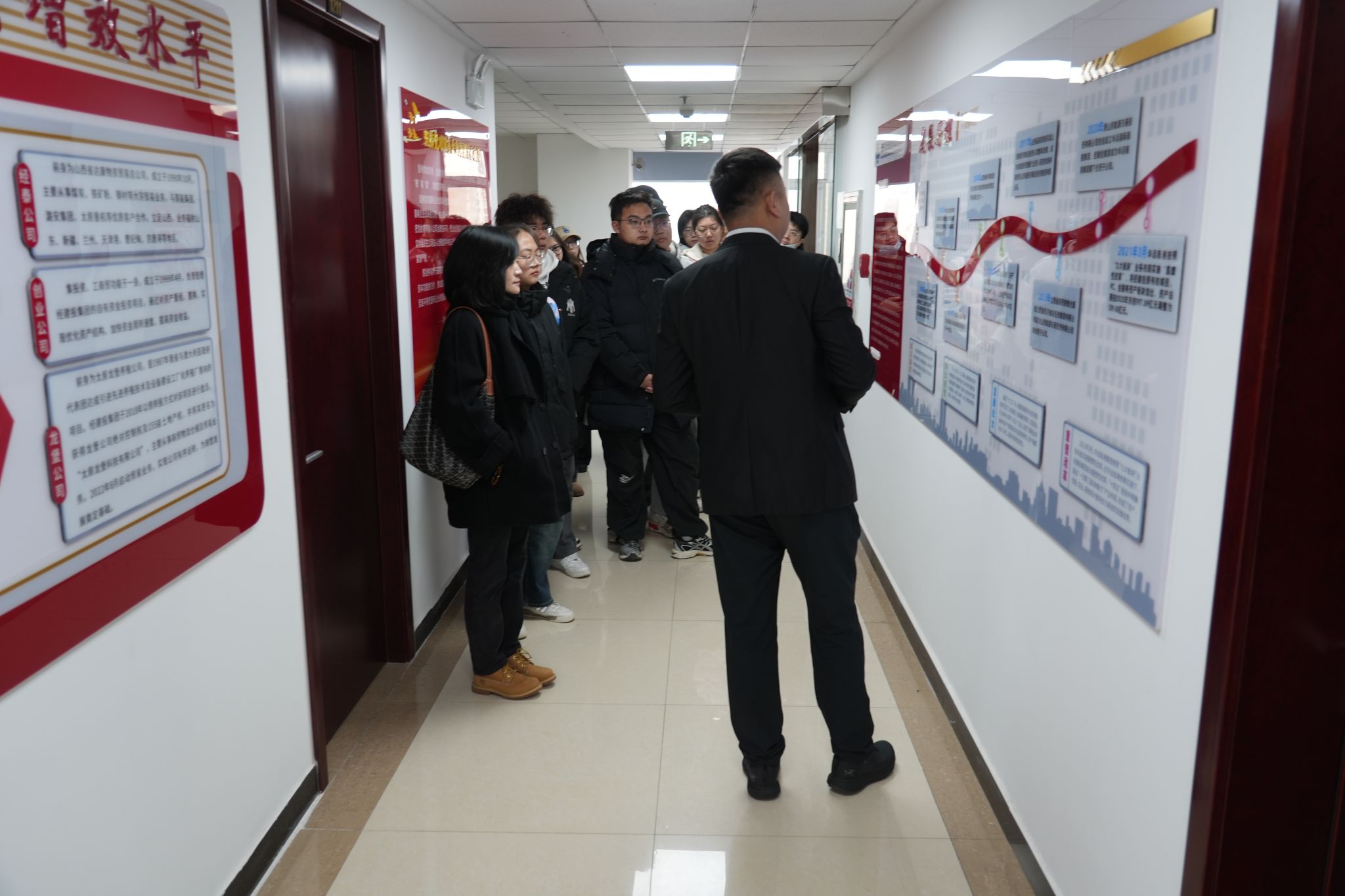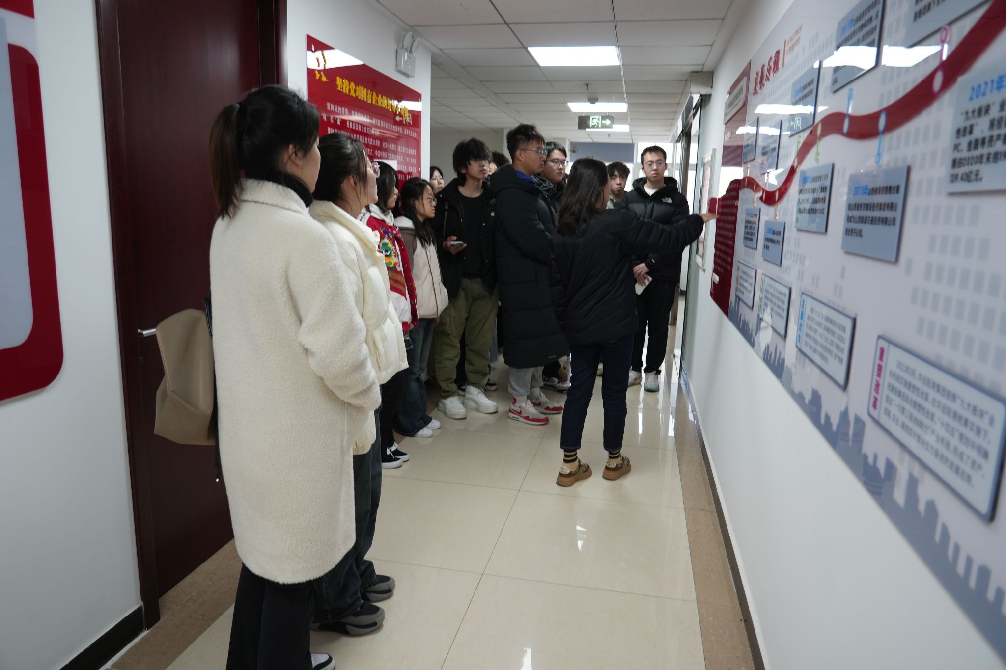 师生分三批对集团各部门、文化墙、产品样品陈列进行了参观、介绍,并观看了企业宣传片。同学们对于经建投集团的发展历程、四大业务板块、业务的发展与转型、党建工作、工会荣誉以及东京热