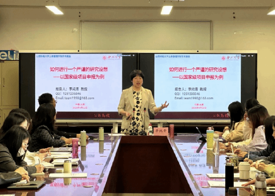 李纯青教授围绕“如何进行一个严谨的研究设想——以国家级项目为例”这一主题,从研究设想的六大要素、国家级项目筹划以及项目结题与申报三个方面展开报告。李教授首先从科学问题的提出与识别入手,强调其在研究中的核心地位,并具体说明了发现科学问题的三种途径。随后,李教授以“多元企业认同”(MCI)项目为例,详细阐述了如何确定研究题目与关键词、规划研究内容、设计技术路线、提出预期结论及选取参考文献,完整呈现了国家级项目研究设想的构建过程。随后,她分享了国家级项目申请的统筹规划与撰写要点,涵盖选题与国家战略的契合、申请书结构与撰写技巧、评审流程与专家关注重点等内容。最后,李教授简要介绍了项目结题与后续申报事宜,鼓励青年教师和博士生保持学术热情与专注,以良好心态投身科研挑战。在互动环节,学院师生积极参与提问,李教授逐一作出细致解答。