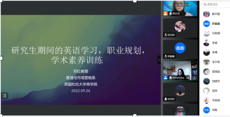 邓红老师围绕研究生期间英语学习、科研提升和职业规划等方面展开。首先,邓老师结合自己的求学经历分享了研究生英文学习经验。听:泛听TED各领域演进,精听知名学者演讲;说:看和模仿脱口秀、美剧等;读:读英文顶刊论文和商业实践类文章;写:积累经典词句,琢磨大牛写作技巧。其次,邓老师围绕研究生期间“如何确定感兴趣的科研方向和选题?如何发现研究问题?如何提升论文写作水平?科研进度时间点如何安排?”等重要问题进行了分享。最后,邓老师总结了“学术写作七步成文法”,即第一步,知己知彼;第二步,前车之鉴;第三步,妙手偶得;第四步,厚积薄发;第五步,胸有成竹;第六步,以终为始;第七步,外圆内方。本次讲座极大地激发了东京热