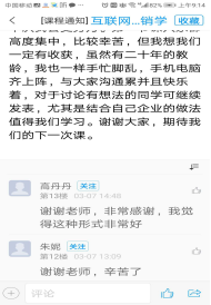 课堂采取观看教学视频、学习PPT、阅读相关资料、课堂互动、讨论、随堂测验、课后作业多种方式相结合,整体课堂教学比较顺利。学生抢答问题相当积极,基本上全班五分之四的同学参与了抢答,因为时间有限,还有部分同学没有机会回答。在讨论过程中,由于背景材料是疫情下远程办公、远程教育问题,与每一位学生息息相关,他们都是参与者,学生发言相当踊跃,部分同学多次参与,不断回复,我必须快速浏览学生观点并做出响应,对高质量发言通过点赞给学生加分。对于一些学生的疑惑,均给予了及时回复,并通过追问加深学生的理解。同时还要对部分好观点进行手机截屏,发微信群供大家学习。通过讨论,帮助同学们提高了运用营销理论分析解决实际问题的能力。最后十分钟对讨论互动过程进行了归类总结,对本次课程需要掌握的知识点及其应用做了再次强调。
