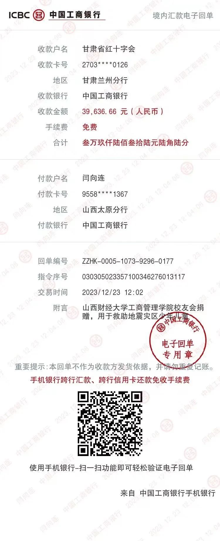 卫虎林院长第一时间向校友会及广大校友发出倡议,为灾区捐献爱心,以实际行动帮助灾区群众恢复生产生活,重建家园。校友会向甘肃红十字会捐款共计39,636.66元。