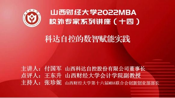 2022MBA校外专家系列讲座第十四期在“腾讯会议”平台圆满举办。山西科达自控股份有限公司董事长付国军带来了题为《科达自控的数智赋能实践》的专题讲座,2022级MBA学员、部分MBA教师、MBA校友、科达自控管理团队等300余人参加,本期讲座还得到MBAChina网站的同步转播。